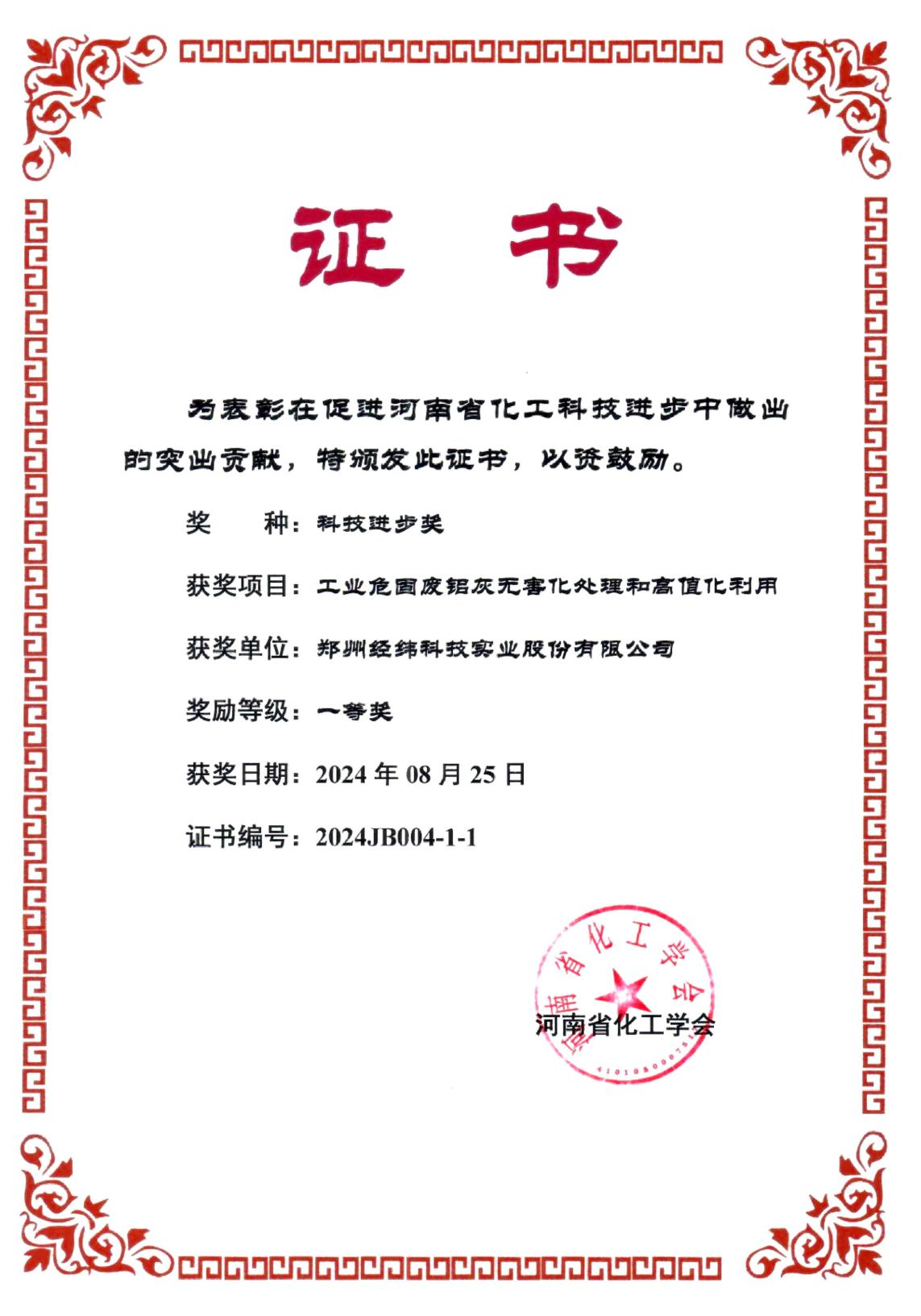 近日,河南省化工学会科技进步奖评审结束,由yl23455永利完成的“工业危固废铝灰无害化处理和高值化利用”技术成果,荣获学会科技进步奖一等奖。