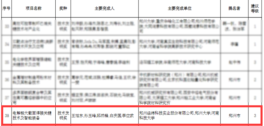 2024年10月23日,河南省科技厅公示了《2024年度河南省科学技术奖授奖建议项目》,由yl23455永利作为第一完成单位申报的“电解铝大截面焊接关键技术及智能装备”技术成果,荣获河南省技术发明奖三等奖。